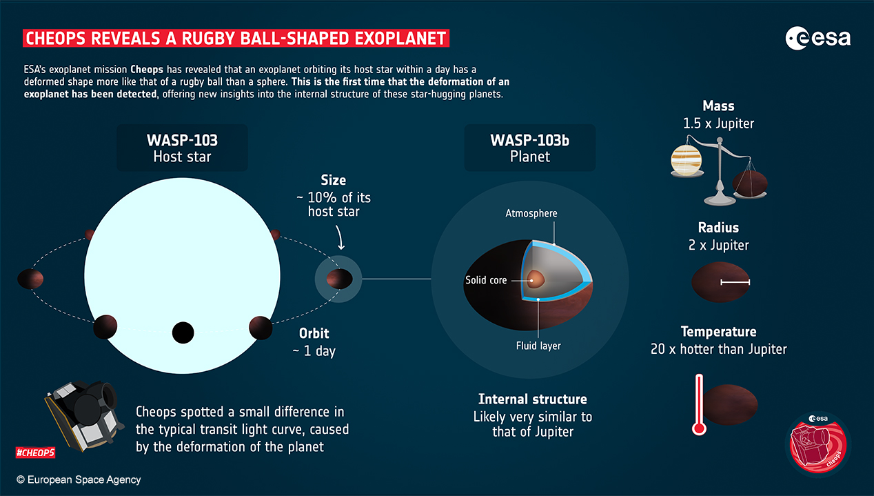Chama-se Wasp-103b, tem 1,5 vezes mais massa e o dobro do diâmetro de Júpiter, o maior planeta do Sistema Solar. Trata-se de um exoplaneta em forma de uma bola de rugby e foi descoberto por uma equipa liderada pela investigadora portuguesa Susana Barros, do Instituto de Astrofísica e Ciências do Espaço (IAstro). Um feito realizado no âmbito de uma missão da ESA - European Space Agency que envolve o CHEOPS (Characterising Exoplanet Satellite), cuja exatidão veio confirmar as suposições dos astrónomos. Um projeto que conta com uma significativa participação de empresas portuguesas., entras as quais a FHP – Frezite High Performance, empresa de espaço do Grupo.