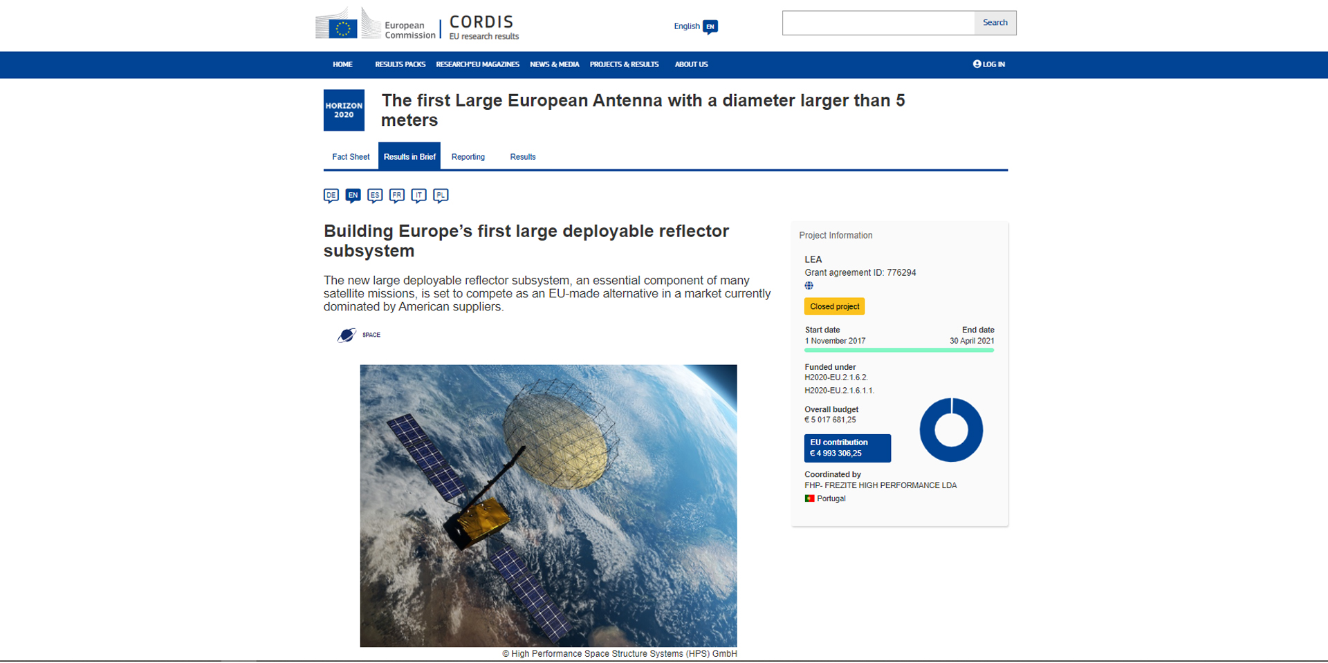 O artigo surge no portal CORDIS, que publica os resultados da investigação na União Europeia, e refere a participação da FHP na LEA – Large European Antenna, o primeiro grande subsistema de refletores destacáveis da Europa. A procura cada vez maior de informação recolhida pelos satélites exige refletores de antena de bordo de maior dimensão. Com cinco metros de diâmetro, a LEA foi submetida a vários testes em terra, de forma a comprovar estar apta a ser usada no Espaço. A FHP esteve envolvida na estrutura da antena. Veja